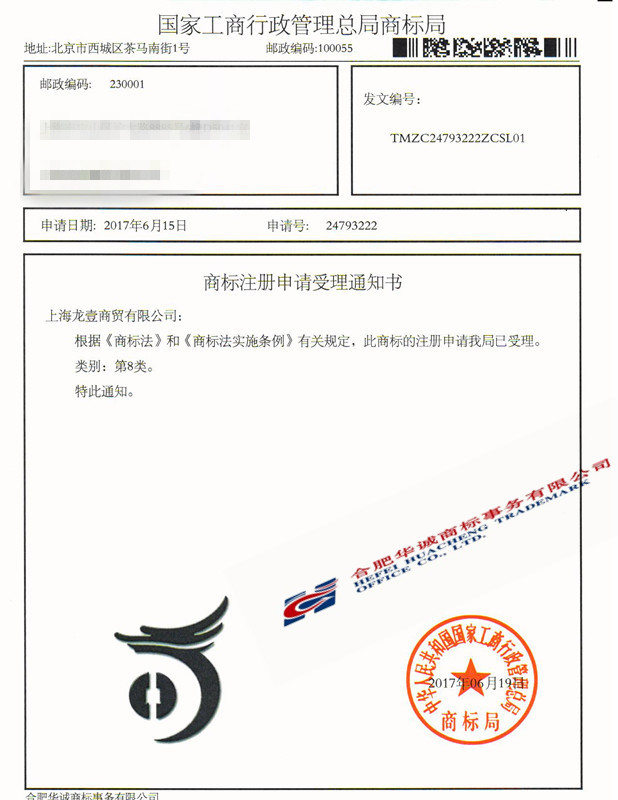 您委托我所代理商标注册申请,名称为“图形”8类商标已被国家商标局受理。