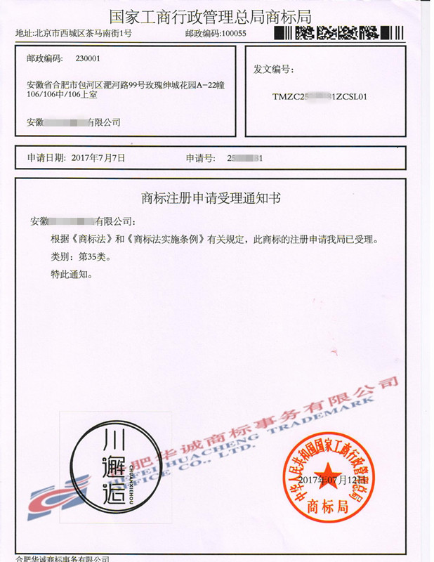 您委托我所代理商标注册申请,名称为“川邂逅”29类、30类、35类商标已被国家商标局受理。