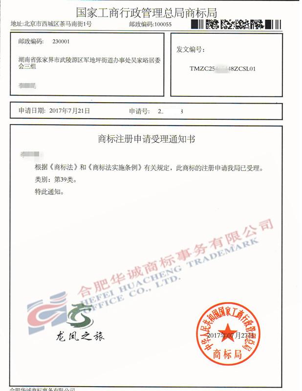 您委托我所代理商标注册申请,名称为“龙凤之旅”39类商标已被国家商标局受理。