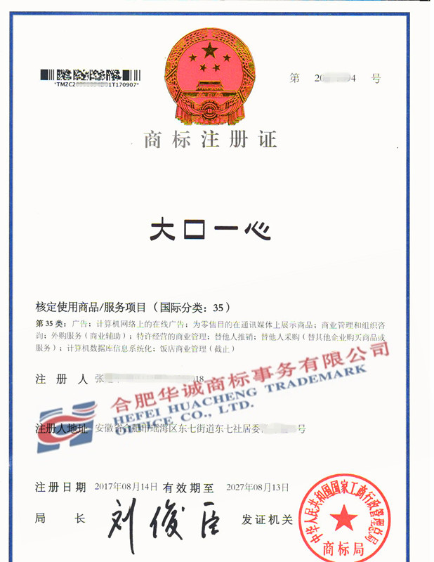 您委托我所代理商标注册申请,名称为“大口一心” 35类商标注册证已下达。