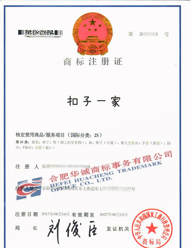 您委托我所代理商标注册申请,名称为“扣子一家” 25类商标注册证已下达。
