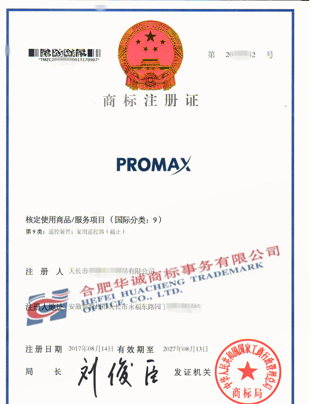 您委托我所代理商标注册申请,名称为“PROMAX” 9类商标注册证已下达。