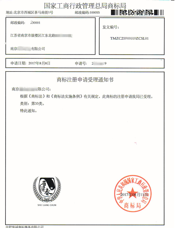 您委托我所代理商标注册申请,名称为“蜀梁春”33类商标已被国家商标局受理。