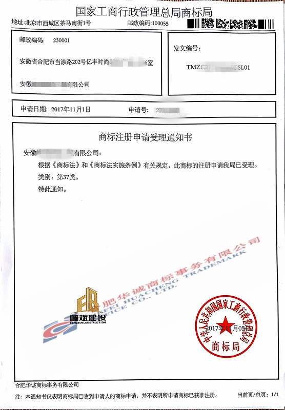 您委托我所代理商标注册申请,名称为“峰斌建设”37类商标已被国家商标局受理。