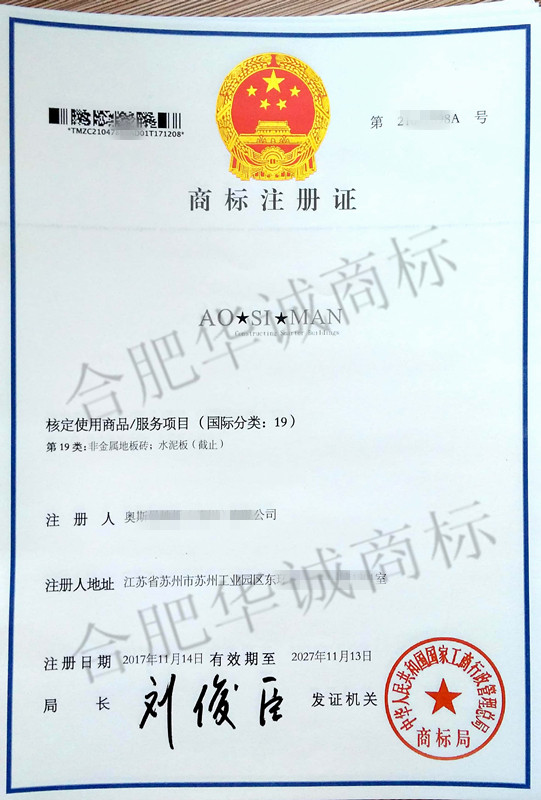 您委托我所代理商标注册申请,名称为“AO SI MAN” 19类商标注册证已下达。