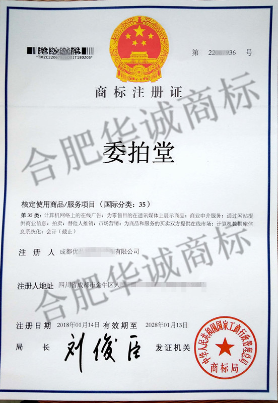 您委托我所代理商标注册申请,名称为“委拍堂” 35类商标注册证已下达。