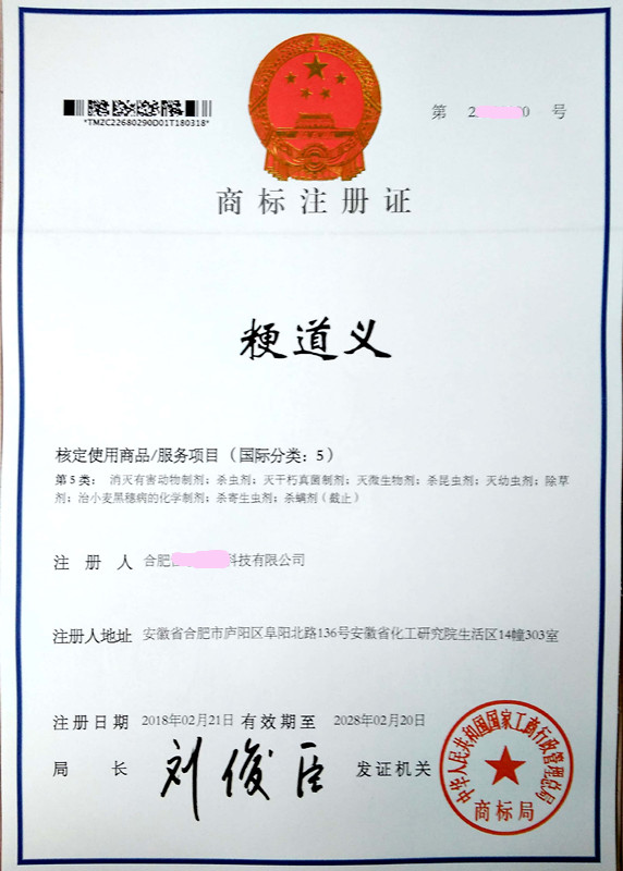 您委托我所代理商标注册申请,名称为“粳道义”5类商标注册证已下达。