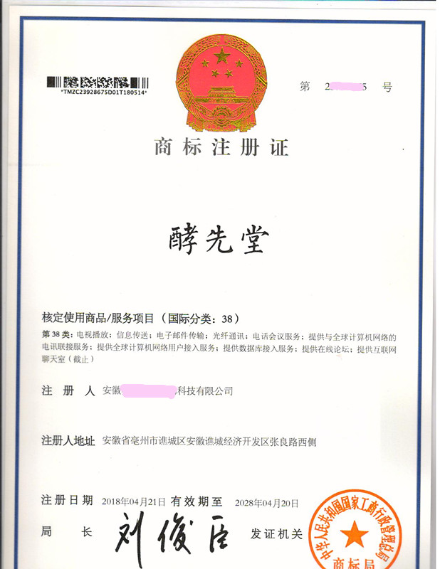 “酵先堂”38类商标注册证下达
