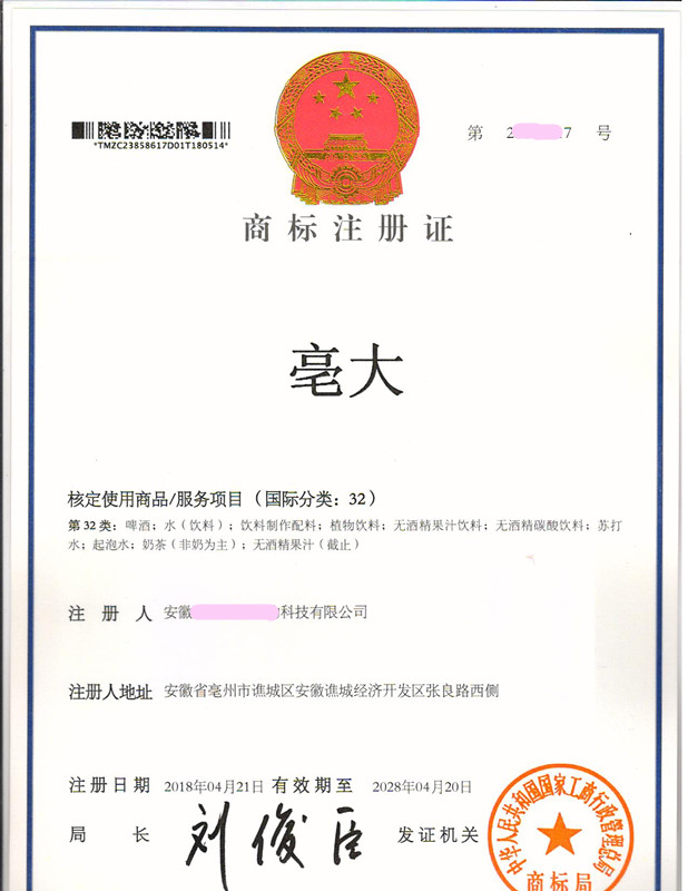 “亳大”32类商标注册证下达