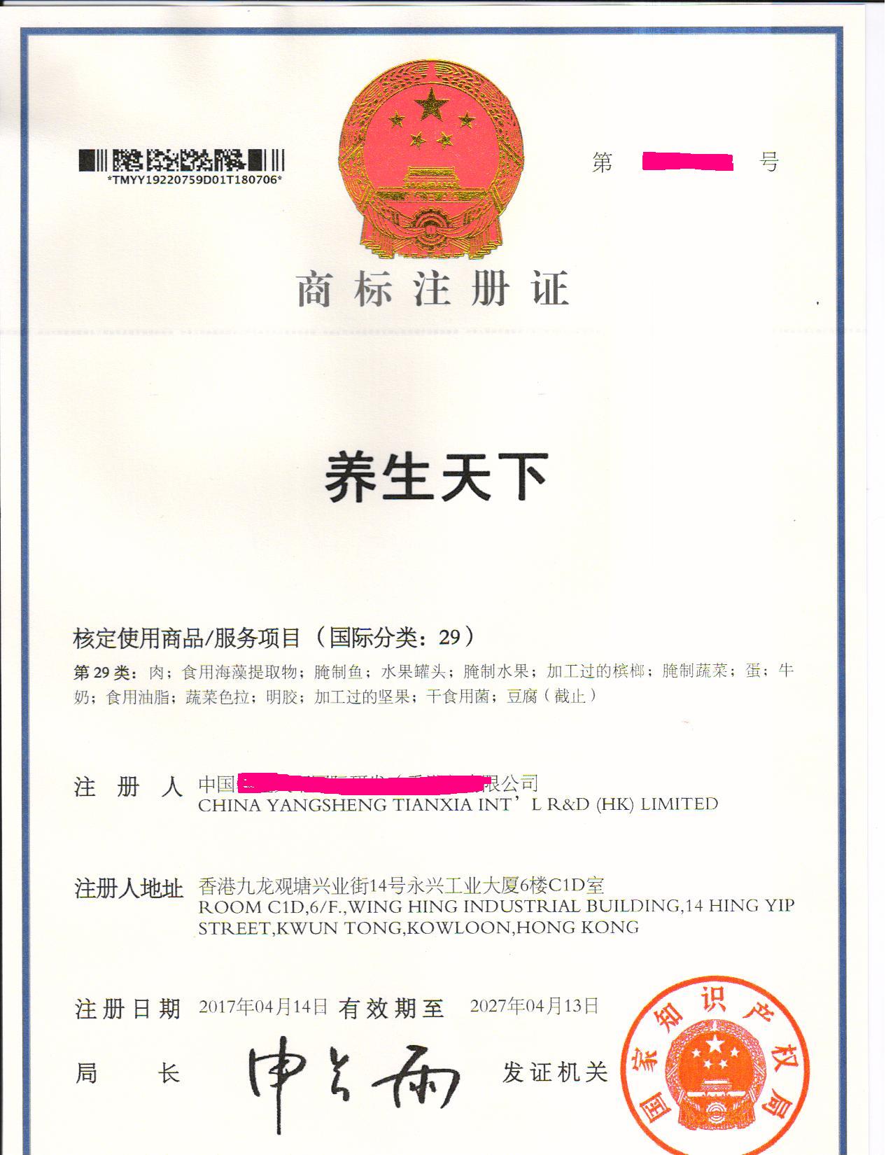 您委托我所代理商标注册申请,名称为“养生天下”29类商标注册证已下达。
