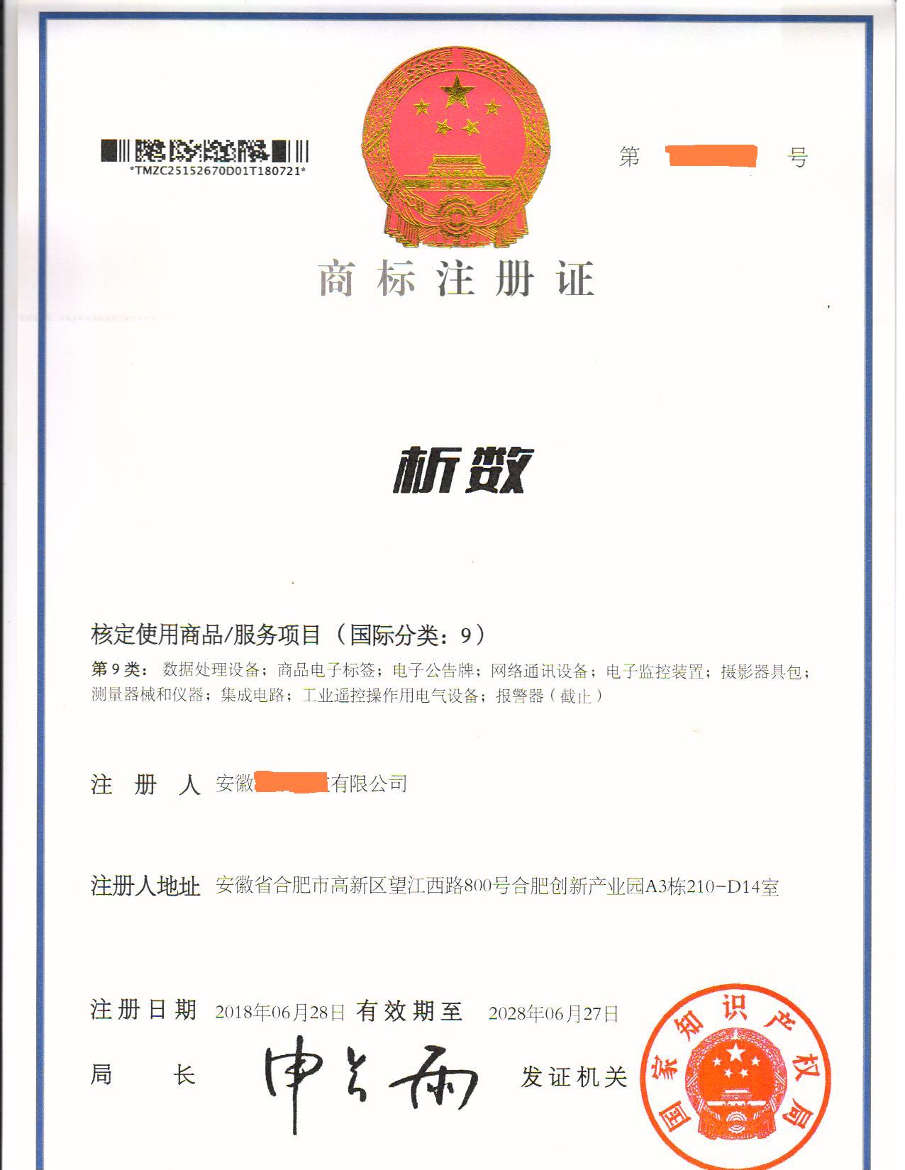 您委托我所代理商标注册申请,名称为“析数”9类商标注册证已下达。