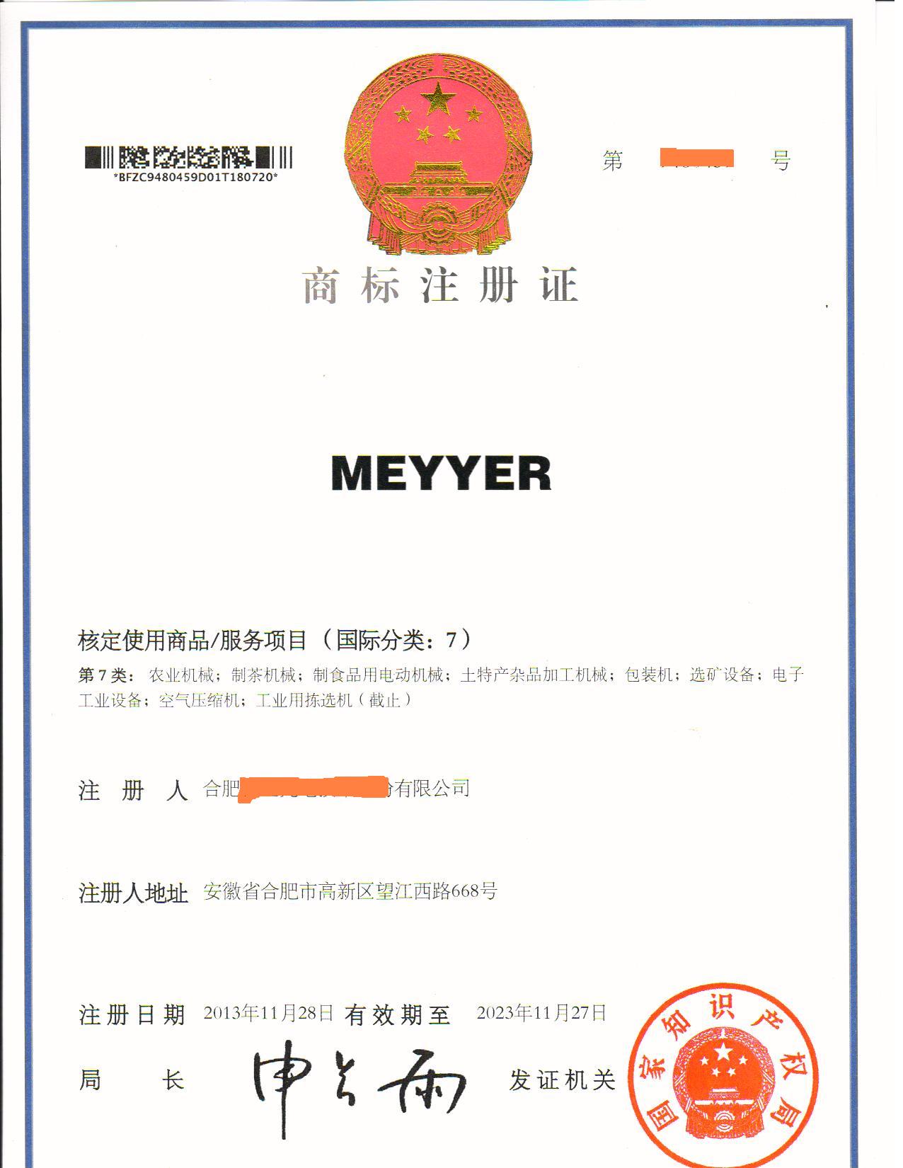 您委托我所代理商标注册申请,名称为“MEYYER”7类商标注册证已下达。