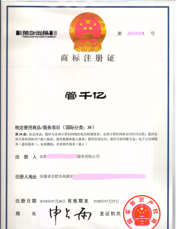 “管千亿”38类商标注册证下达